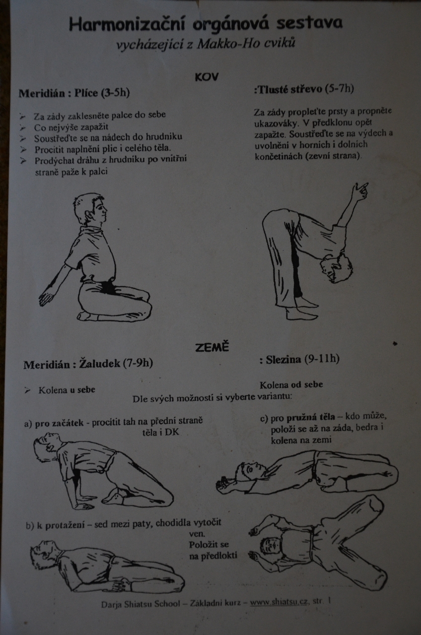 A než bych se dostal k popisu např. Harmonizační orgánové sestavy, vycházející ze cviků Makko-Ho, známých také jako "meridiánová rozcvička" ze shiatsu, tak přidávám teď jen obrázky ne zcela kvalitní, ale mohou pro začátek postačit. Sestavu, která principiálně a zjednodušeně řečeno kombinuje jógové cvičení a strečink, Vám opravdu vřele doporučuji. Pro další inspiraci najdete níže i nějaké informace ke cvičení Pět Tibeťanů, atd.